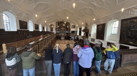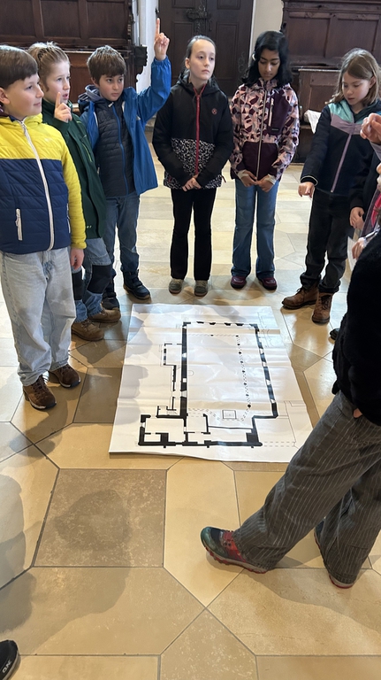 Am 24.2.26 machten wir, die Klasse 4c, einen Ausflug in die Sankt Ulrich Kirche. Zuerst redeten wir über den Schall, dann spielten wir ein Geometrie-Spiel mit Formen. Immer wenn unsere Führerin Frau Wünsch eine Form hochhielt, sollten wir diese am Boden suchen und uns daraufstellen. Frau Altenburger spielte auch mit. Danach beschrieben wir den Grundriss und die Himmelsausrichtung der Kirche. Anschließend gingen wir eine abgetretene Treppe hinauf und lernten dort die römischen Zahlen auf der Uhr kennen. Außerdem rechneten wir Jahreszahlen aus.