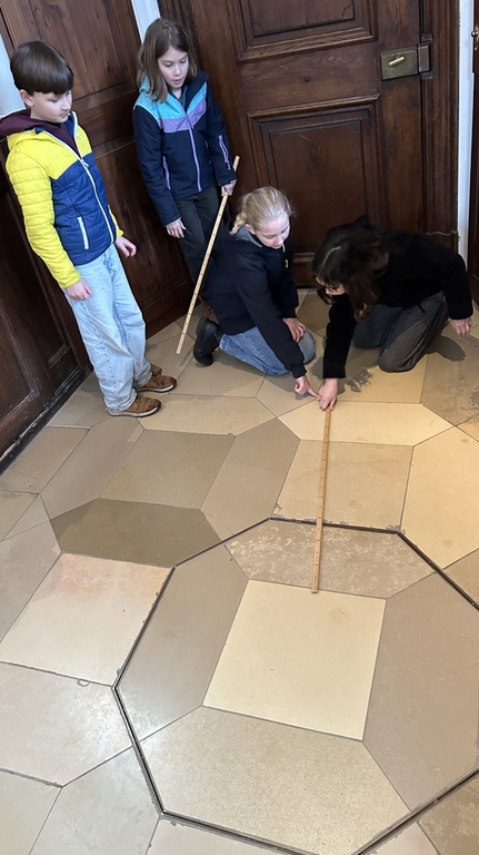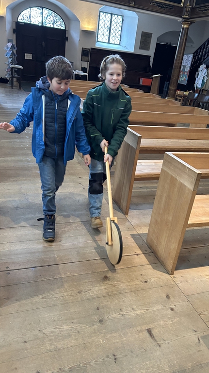 Zum Schluss kam das Messen an die Reihe. Wir lernten Körpermaße, wie Elle, Armspanne, Fuß und Schritt kennen und schätzten, wie lang, breit und hoch die Kirche ist. Danach maßen wir nach. Die Kirche ist 17 Meter breit und 33 Meter lang. Unsere Messgeräte waren Meterstock und ein „Meter-Mess-Rad“. Wie wir die Höhe der Kirche abgemessen haben, bleibt ein Geheimnis und muss von euch selbst herausgefunden werden. Also macht euch bereit auf ein großartiges Erlebnis in der Sankt Ulrich Kirche!