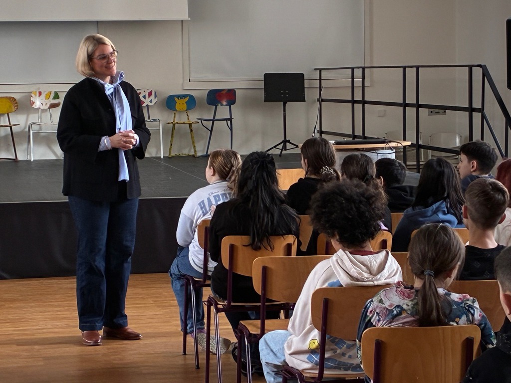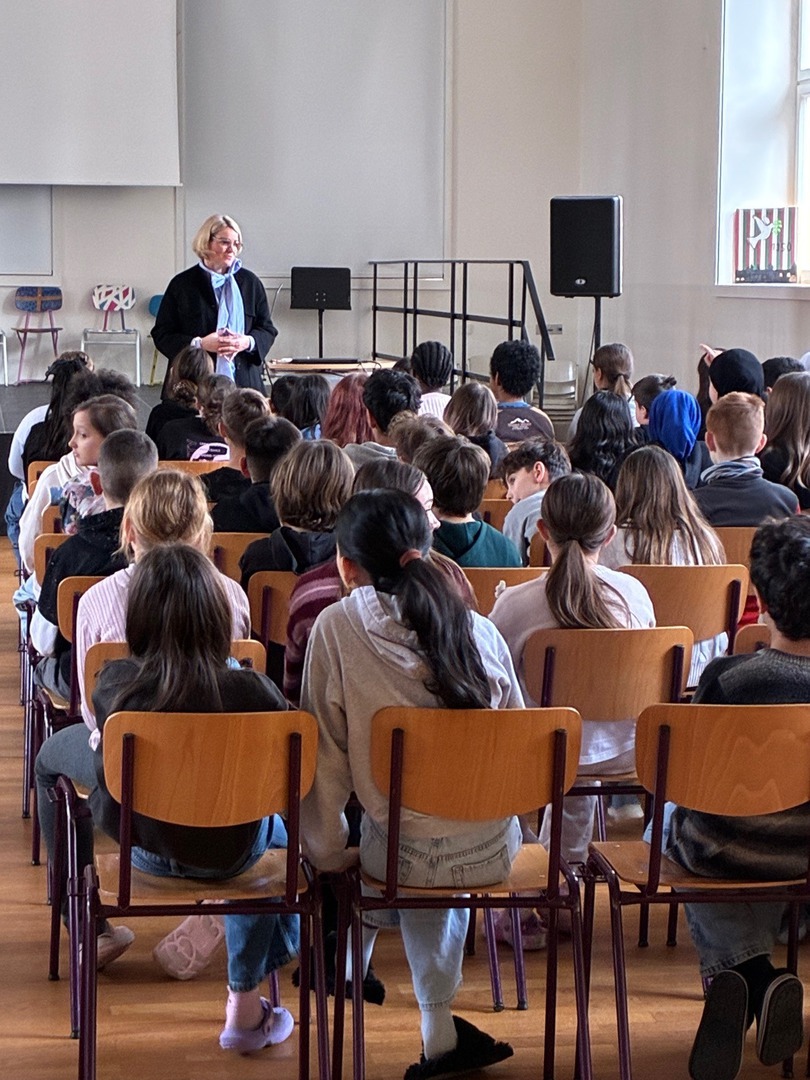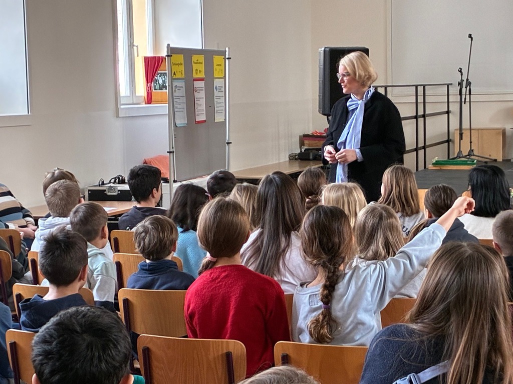 Am 18.Februar 2025 war es endlich wieder soweit und die Augsburger Philharmoniker kamen mit Ihrem „Klingenden Klassenzimmer“ zu uns an die Schule. Die fünf Musiker:innen spielten für unsere Erstklässler mit ihren Streichinstrumenten verschiedene Musikstücke vor. Der „Karneval der Tiere“, aber auch die „deutsche Nationalhymne“ oder ein Stück von Wolfgang Amadeus Mozart waren in dem breiten Repertoire vertreten. Die Schüler und Schülerinnen lernten die Besonderheiten der einzelnen Instrumente kennen und durften dann mit den Musikern ein Lied gemeinsam singen. Es war wie jedes Mal wieder ein besonderes Erlebnis und wir freuen uns jetzt schon auf ein Wiedersehen.